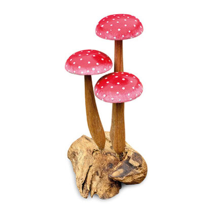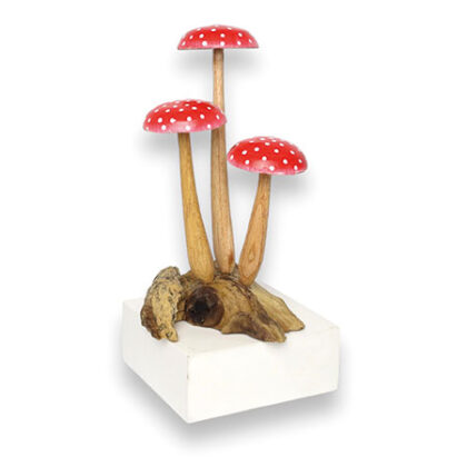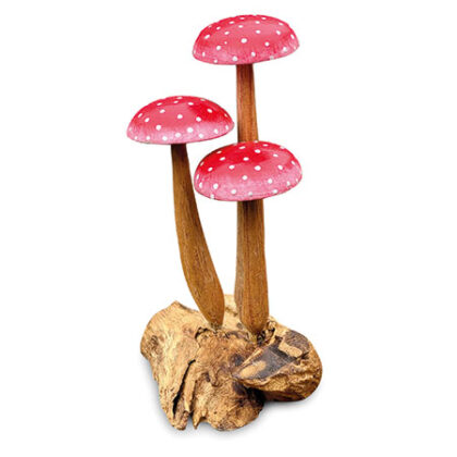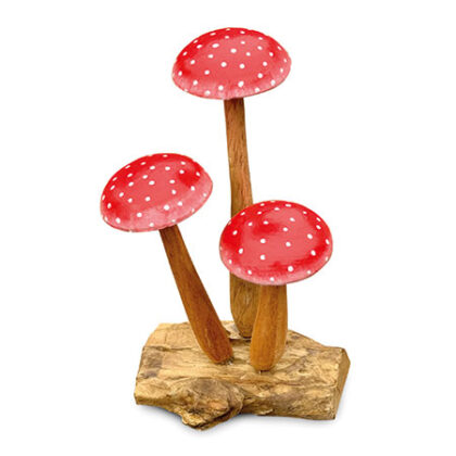 Wooden mushroom ornament featuring three red-capped mushrooms with white spots. The mushrooms are mounted on a piece of natural wood. Dimensions: W 8 x D 8 x H 16.5 cm