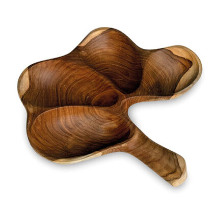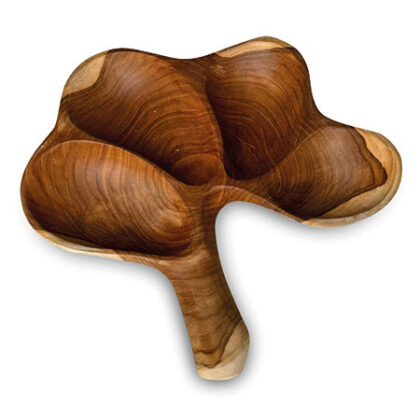 Hand crafted decorative wooden bowl with four compartments and a handle. Ideal for serving snacks or as a display piece.