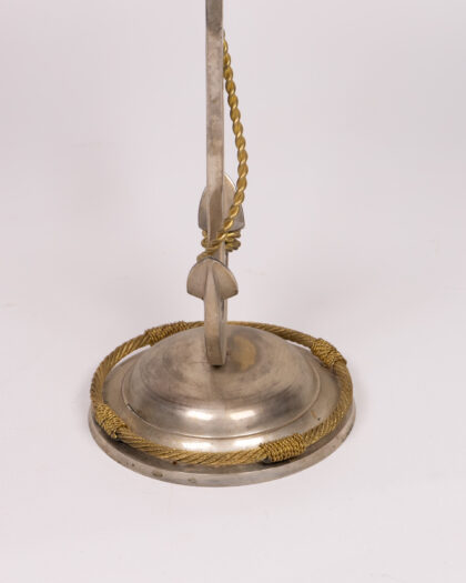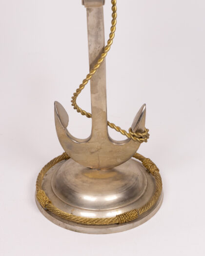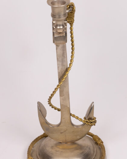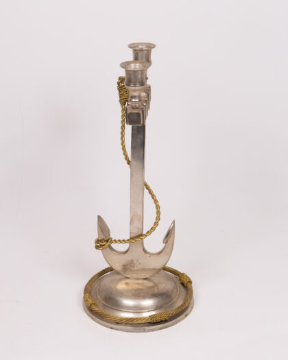 A decorative metal candlestick holder in the shape of an anchor. The anchor is finished in silver, with a gold rope wrapped around the base and top. This candlestick holder could be used for candles or as a decorative accent piece in a nautical themed space. Condition is good with minor wear. Perfect for adding a nautical touch to any room.