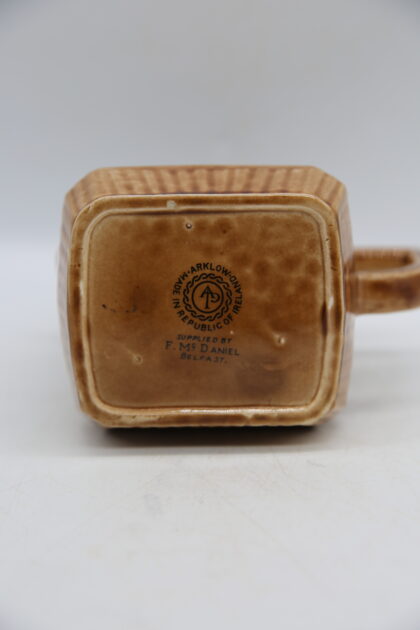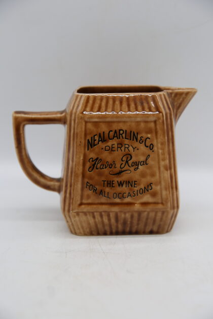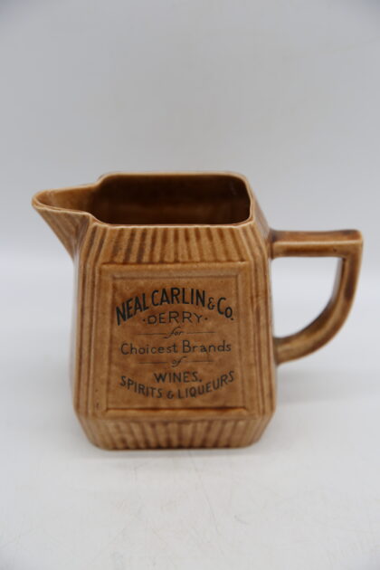 A brown glazed ceramic bartop water jug. Bears black lettering which reads, "Neal Carlin & Co. Derry for Choicest Brands of Wines, Spirits & Liqueurs" on one side and on the other it reads, "Neal Carlin & Co. Derry Flavor Royal The wine for all occasions". Made by Arklow Ireland and bears black backstamp to base along with the lettering, "Supplied by F. McDaniel Belfast".