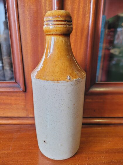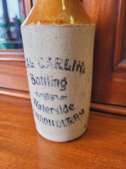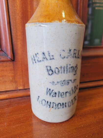 A brown, two-tone glazed stoneware bottle. Bears black lettering which reads, "Neal Carling Bottling Waterside Londonderry".