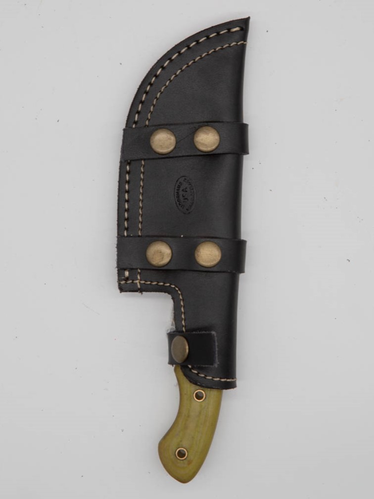 Moorhaus made knife with a damascus steel forged blade and a matching black leather sheath.