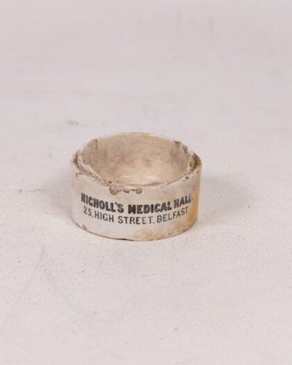 An antique ceramic ointment pot from Nicholl's Medical Hall, 25 High Street, Belfast. This small pot is cream with black printed text. The pot is missing its lid. The ceramic has a crazed glaze and some discolouration and chips around the rim due to age. I
