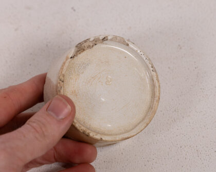 Antique ceramic ointment pot from Nicholl's Medical Hall, Belfast. Cream with black text, no lid, crazed glaze, some chips.