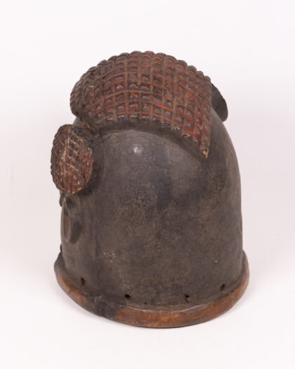 Hand-carved African tribal mask featuring a dark finish. The mask has carved facial features, including eyes, nose, and mouth, as well as a patterned headdress. The mask shows signs of age and wear, including some cracks in the wood and general wear. This mask would make an eye-catching display piece, adding a touch of global culture to any room. The mask is made from wood and is a darker brown / black tone.