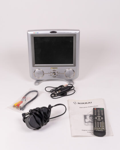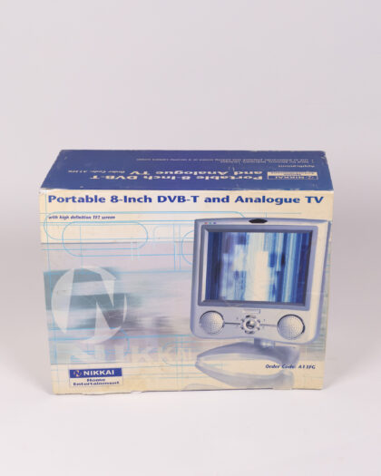 Nikkei 8-Inch DVB-T and Analogue TV with high definition TFT screen. Portable television set in original box with remote, power cables, and instructions. Includes a telescopic antenna. Silver plastic case. Model number is DV0-T. Untested.