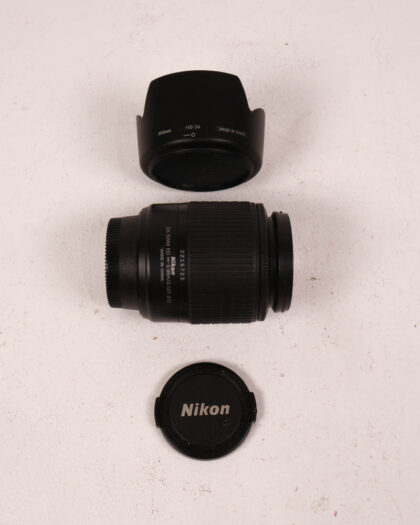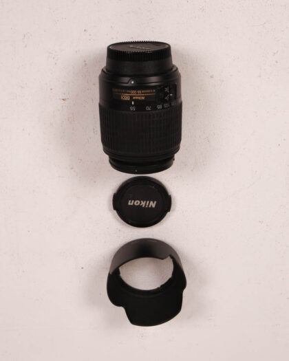Nikon AF-S DX Zoom-Nikkor 55-200mm f/4-5.6G ED lens kit with lens hood, cap, soft case and instructions. In good used condition.