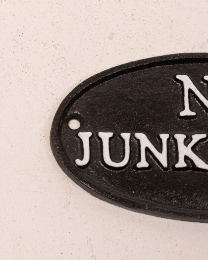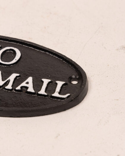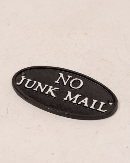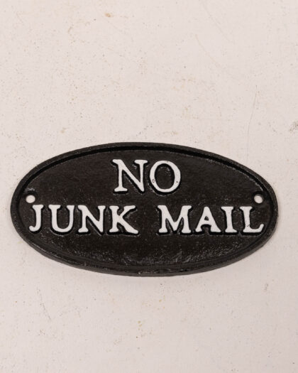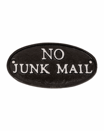 This polite-but-firm cast iron sign conveys the warning: "No Junk Mail". Raised handpainted letters are set against a deep black background, ensuring that the message is visible and easily understood. Perfect for households and offices that want to reduce unwanted letters, the classic design means it integrates nicely into almost any decorative setting. Durable cast iron construction ensures that this sign will stand the test of time. Predrilled holes make it a breeze to mount on a wall, door or gate of your choice.