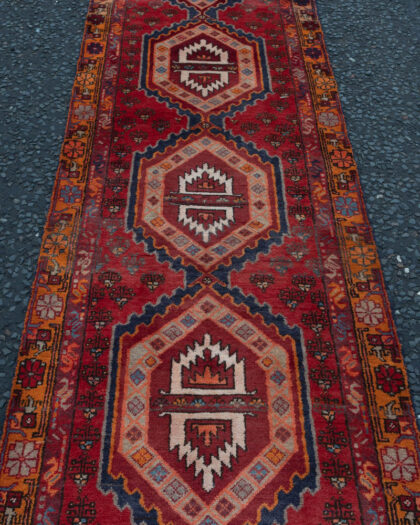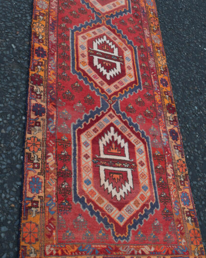 This is a hand-knotted Iranian wool runner rug, originating from Northern Iran. The rug features a central field with repeating geometric medallions in shades of red, orange, blue, and cream. These medallions are arranged in a line down the length of the rug. A complex border pattern with small motifs surrounds the field, adding depth and visual interest. The rug is constructed from a full wool pile, giving it a heavy and luxurious feel.
