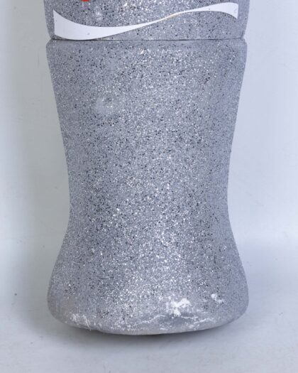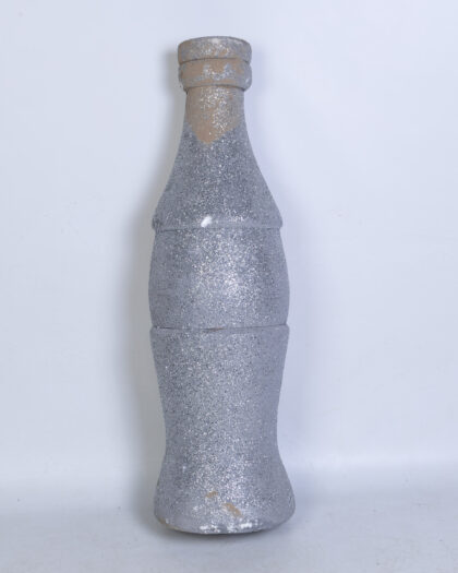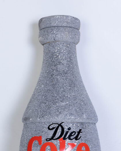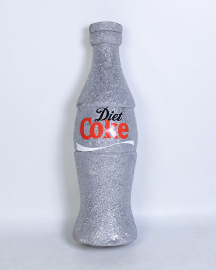 Add a touch of retro charm to your space with this striking Diet Coke bottle ornament. The bottle is finished in a sparkly silver glitter. The classic 'Diet Coke' logo is prominent in red and black, with a white wave detail underneath. This novelty ornament would look great in a kitchen, home bar or living room. Condition: While generally in good condition, it does show some signs of age and wear, commensurate with its material and history. There are a few spots where the glitter is thin or missing, particularly near the base.