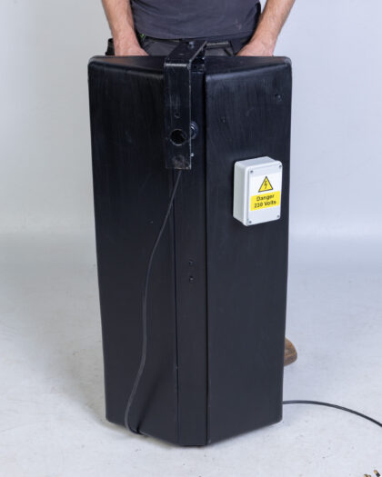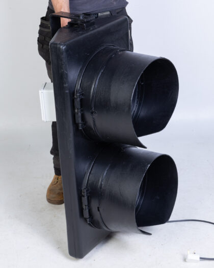 This pedestrian traffic light features a black plastic casing with illuminated red and green figures. The red figure indicates 'do not walk' while the green figure indicates 'walk'. It's designed for indoor use, offering a unique and practical decorative item. This item is in good condition with minor wear on the plastic casing. The lights are fully functional and bring an industrial aesthetic to any room. It has a 230 Volts danger sticker present. It comes with a standard UK 3 pin plug.