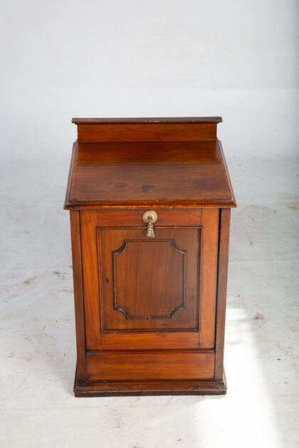 A small oak box with a tilting drawer for storing coal in. Features a small shovel.