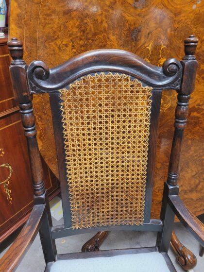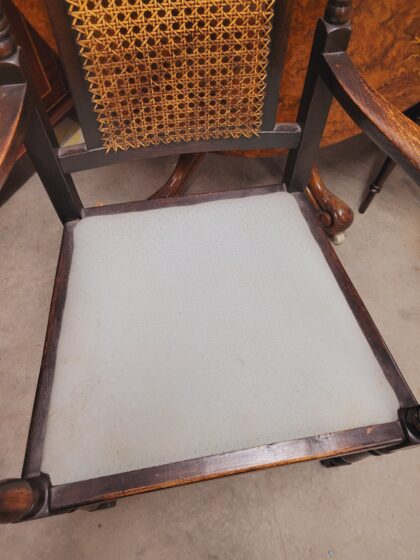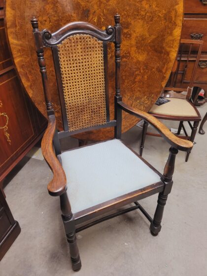 Oak armchair with rattan back and light blue cloth seat.