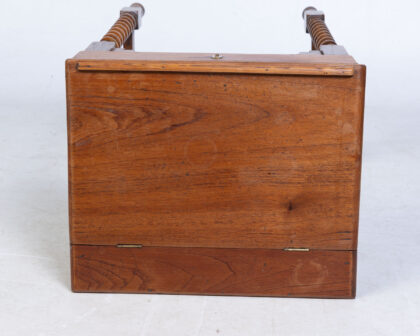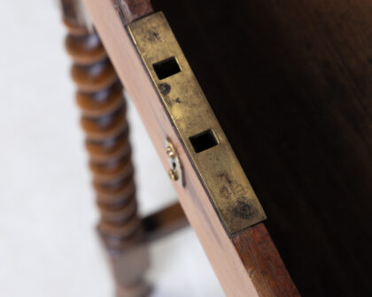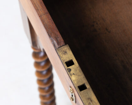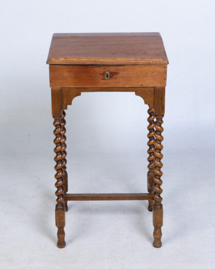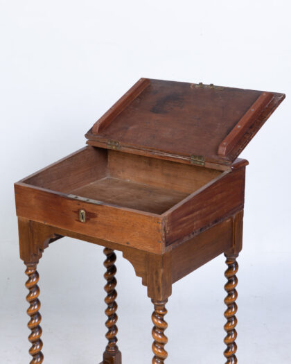 This vintage desk features a hinged top that opens to reveal a storage compartment, perfect for writing supplies. The desk has a small drawer, complete with a keyhole. It stands on elegant barley twist legs, adding a touch of classic charm to any space. Condition is consistent with its age and adds to its authenticity. Perfect for a study, living room or even bedroom.