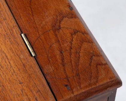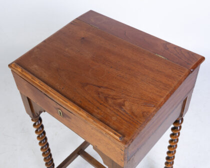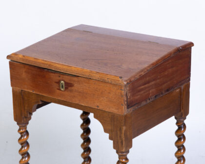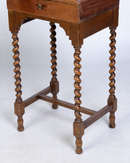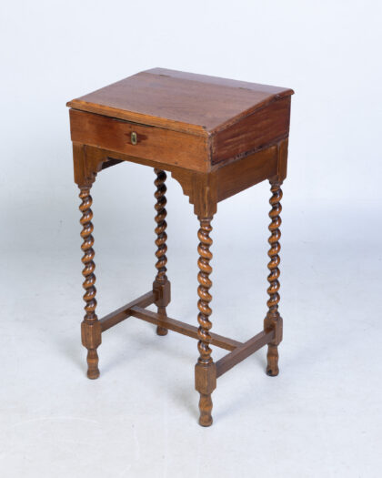 Oak writing desk with hinged top, small drawer, and barley twist legs. Perfect for adding a touch of classic charm to your home.