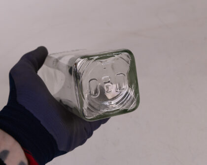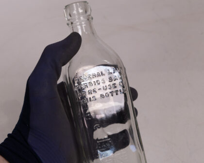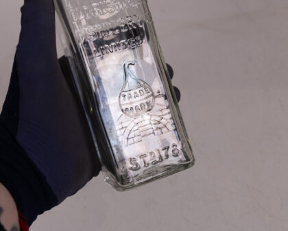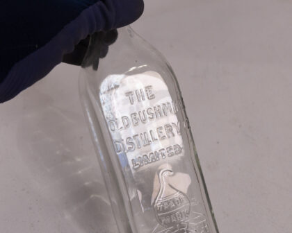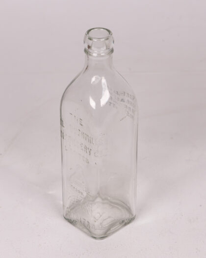 Vintage clear glass bottle from The Old Bushmills Distillery Co. Limited with raised lettering and 'Trade Mark' logo. A great display piece.