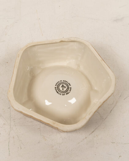Vintage Old Bushmills Whiskey ashtray made in Arklow, Republic of Ireland. This ceramic ashtray features a unique design resembling a brick structure, with the words 'Old Bushmills Whiskey' prominently displayed. The base has the stamp 'Made in Arklow, Republic of Ireland'. In good condition.