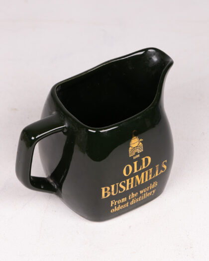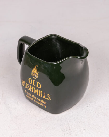 Vintage Old Bushmills green ceramic advertising jug, featuring gold lettering and Wade PDM England hallmark. Perfect for a collector.