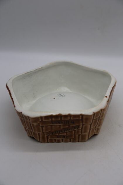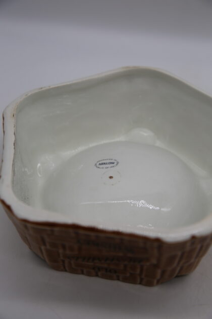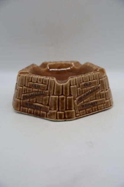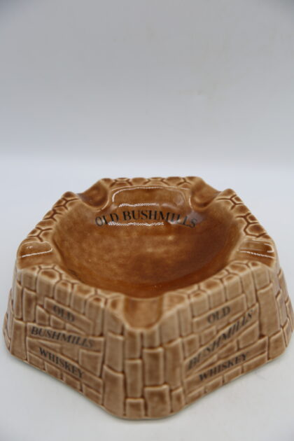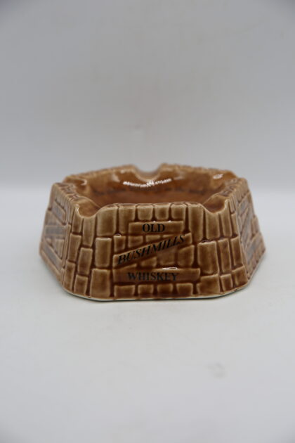 A brown glazed ceramic ashtray. Bears black lettering which reads, "Old Bushmills Whiskey The oldest Whiskey in the world". Made by Arklow Ireland and bears grey backstamp to base.