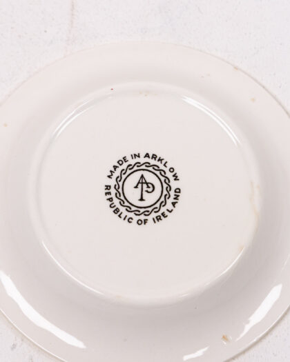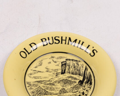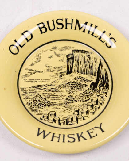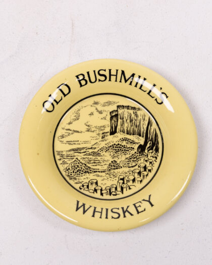 This vintage Tip Plate celebrates Old Bushmills Whiskey, a renowned Irish whiskey brand. The ashtray features a pale yellow background with black lettering and an illustrative scene in the centre. The scene depicts the iconic Giant's Causeway, a natural rock formation in Northern Ireland, further reinforcing the brand's Irish heritage. The plate has a white back with 'Made in Arklow, Republic of Ireland' visible. A charming piece of Breweriana.