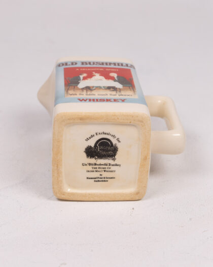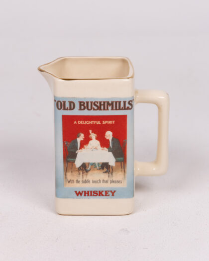Vintage Old Bushmills Whiskey jug, crafted from cream-coloured ceramic with elegant gold trim. Features a classic 'Old Bushmills' advertisement depicting a sophisticated gathering. Made Exclusively for the Old Bushmills Distillery by Diamond China & Ceramics Staffordshire. The Home of Irish Whiskey. Ideal for collectors of breweriana, whiskey memorabilia, or those seeking unique home bar accessories. A charming piece of Irish brewing history.