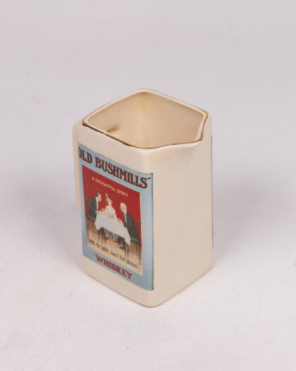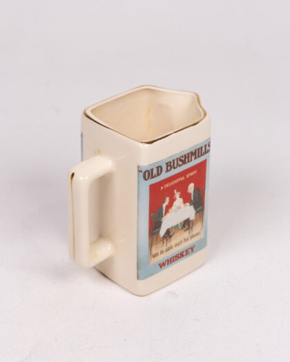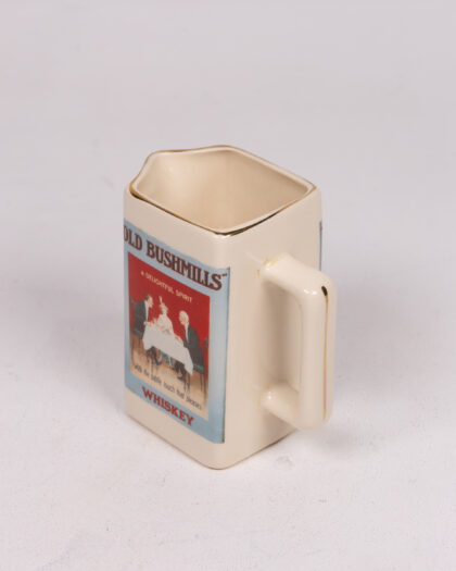 Vintage Old Bushmills Whiskey jug. Cream ceramic with gold trim featuring a classic advertisement. Perfect for collectors of Irish whiskey memorabilia.