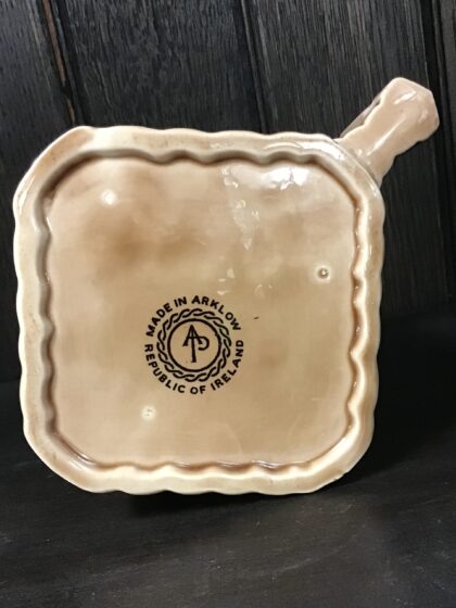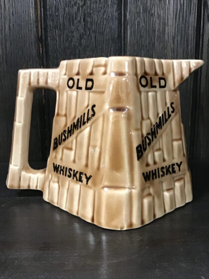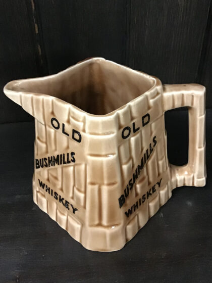 A brown glazed ceramic bartop water jug. Bears black lettering that reads "Old Bushmills Whiskey" on all four sides. Made by Arklow Ireland and features black backstamp to base.