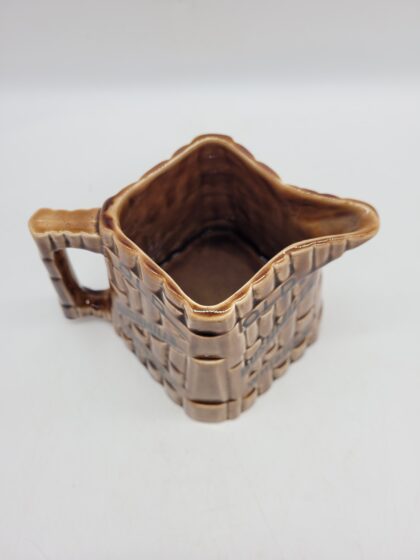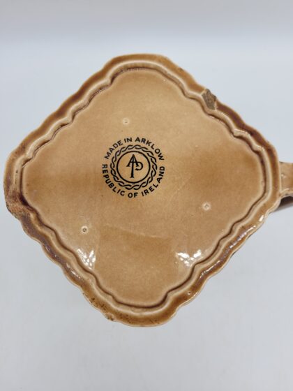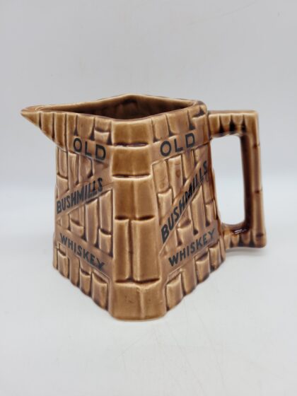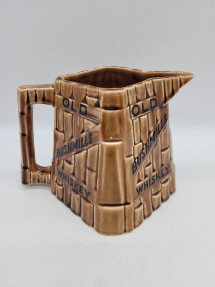 A brown glazed ceramic bartop water jug. Bears black lettering that reads, "Old Bushmills Whiskey" and black backstamp to base which reads, "Made in Arklow Republic of Ireland". 2 small chips to bottom of jug but not noticeable if sitting normally. 11.5cm high