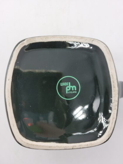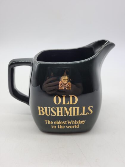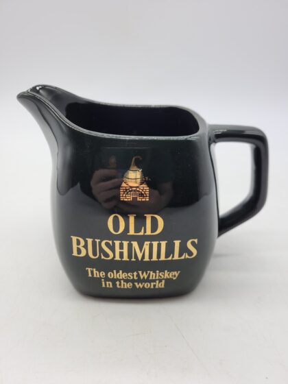 A green glazed ceramic bartop water jug. Bears gilt lettering which reads, "Old Bushmills The oldest Whiskey in the world". Made by Wade and bears green backstamp to base.