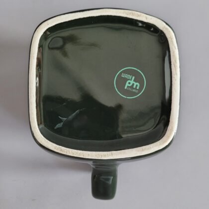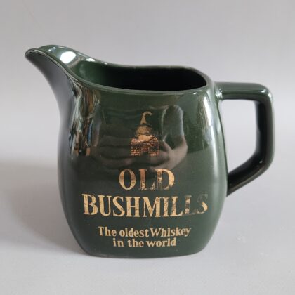 A green glazed ceramic bartop water jug. Bears gilt lettering which reads, "Old Bushmills The oldest Whiskey in the world". Made by Wade and bears green backstamp to base.