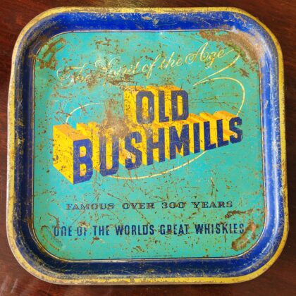 Reads, "The Spirit of the Age Old Bushmills Famous Over 300 Years One of the Worlds Great Whiskies".