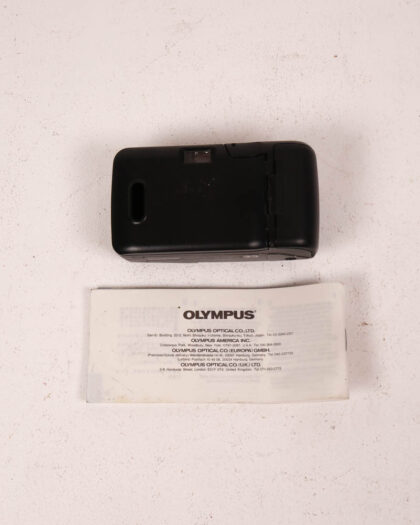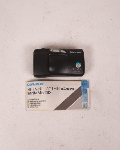 This is a vintage Olympus AF-1 Mini camera, known for its compact size and user-friendly design. The camera features a black plastic body with a sleek, minimalist aesthetic. It comes with the original instruction manual, detailing the camera's functions and operation. The camera is in good condition for its age, with minimal signs of wear. This Olympus AF-1 Mini is perfect for film photography enthusiasts and collectors alike and can be displayed on a shelf.