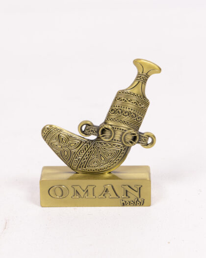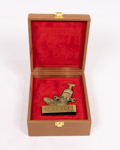 This is a souvenir from Oman, featuring a Khanjar dagger. The piece is made of gold-tone metal and is presented in a brown display box lined with red fabric. The dagger itself is ornately decorated with etched patterns. The word 'OMAN' is displayed on the base of the dagger. The box has a clasp and hinges. In excellent condition.