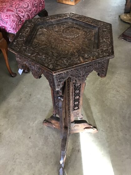 Nicely worked piece with fine carving to top surface and buttress legs; some wear and tear commensurate with age.