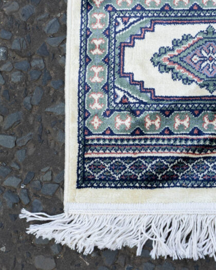 Small oriental wool rug with cream field, navy and green detailing, and fringed edges. Good condition.