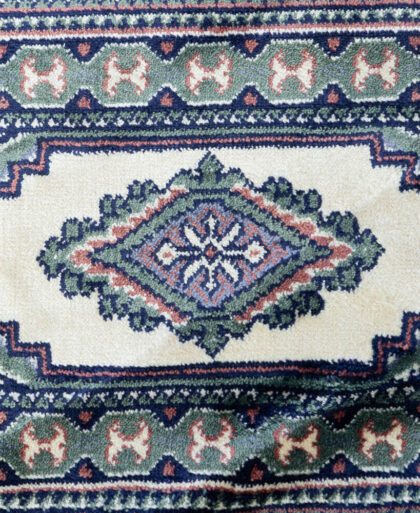 This is a small oriental rug with a cream coloured field and geometric designs in green, blue and pink. A central diamond shape is surrounded by multiple borders, filled with small decorative motifs. The rug has a dense pile and is fringed at either end. The rug is in good condition and would make a nice addition to a living room or bedroom.