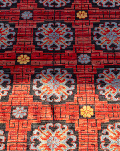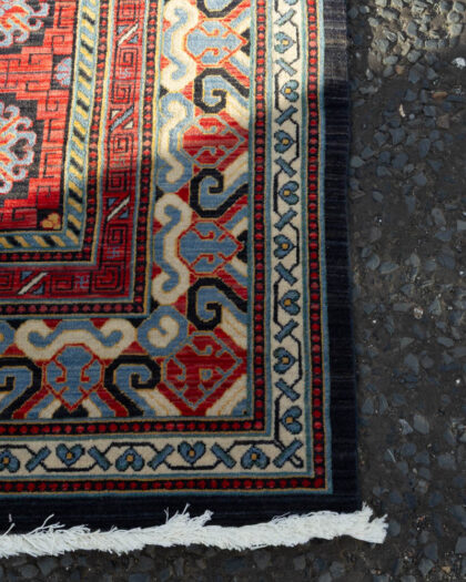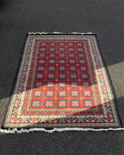 This is an oriental-style wool rug featuring a vibrant red field adorned with a repeating pattern of geometric floral motifs in shades of blue, black, and small amounts of yellow. A light border surrounds the main field, decorated with detailed stylized patterns in a palette that complements the central design. The rug is finished with a fringed edge. The wool is in good condition.