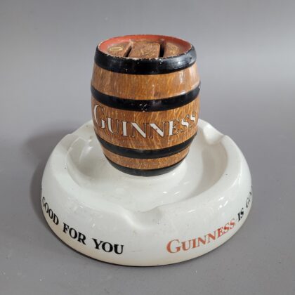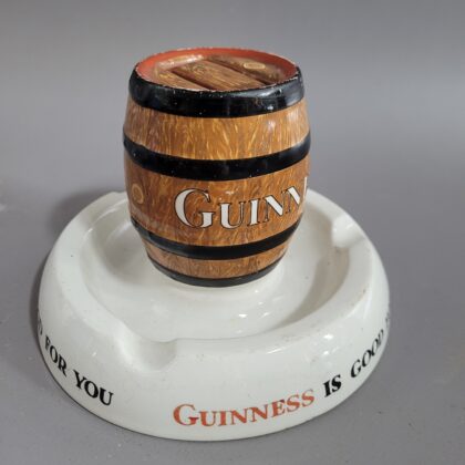 An original white glazed ceramic ashtray and match holder by Guinness. Bears red and black text that reads, "Guinness is good for you". In the form of a barrel which holds a box of matches. Black lettering to base that reads, "GA/A/254 Produced in Great Britain by Mintons Ltd. Stoke-on-Trent Rgd. No778941".