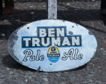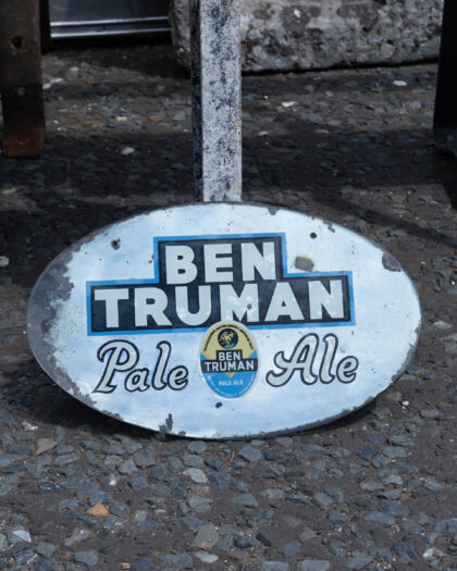 This is an original oval-shaped mirror advertising Ben Truman Pale Ale. The mirror features bold lettering in black and white against a blue background for "BEN TRUMAN" at the top. Below, it reads "Pale Ale" in a script font. A circular logo depicting the beer's label is in the centre. The mirror has a distressed look, with some wear around the edges, adding to its vintage charm. The overall design and aged appearance make it a great addition to a vintage collection or as a decorative piece for a home bar or pub.