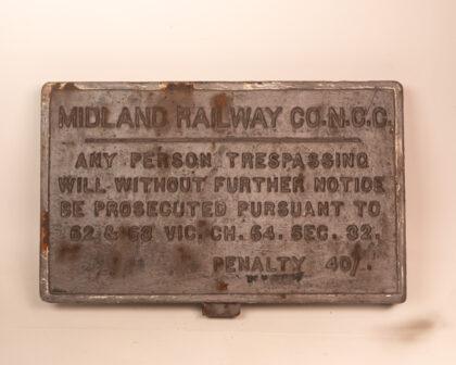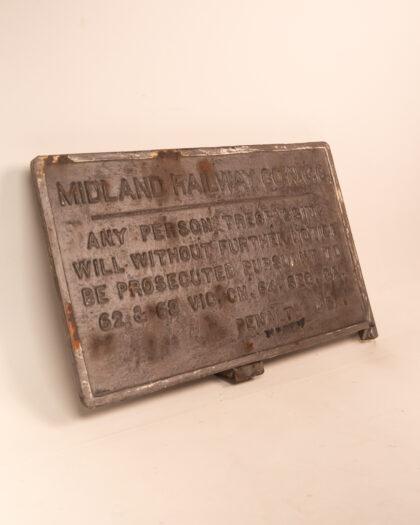 Original Vintage Midland Railway Co. cast iron sign warning against trespassing.