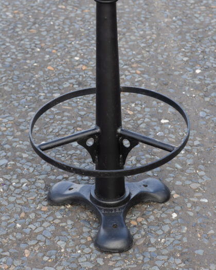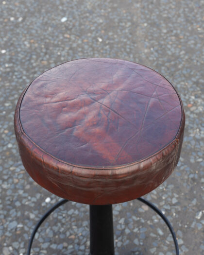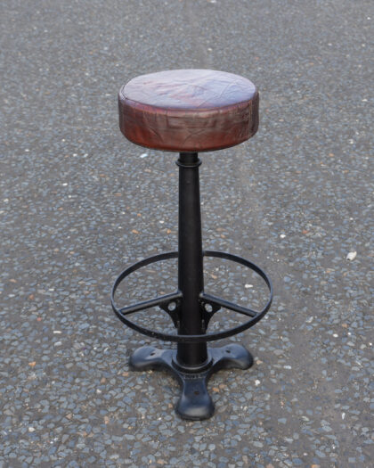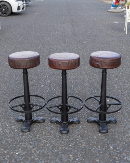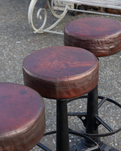 These original Singer bar stools have a solid black base and stylish deep red leather seats.