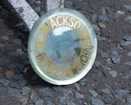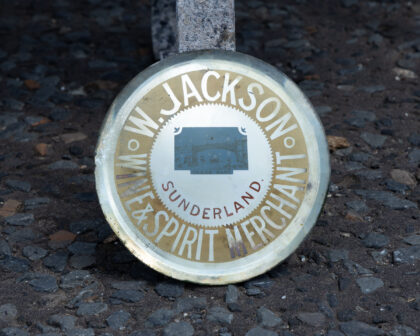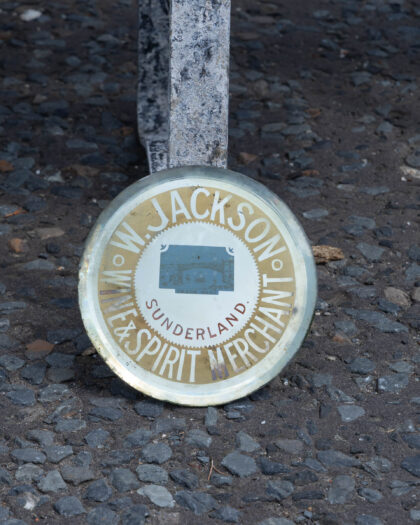A small advertising mirror for W. Jackson, Wine & Spirit Merchant, Sunderland. The text is in gold lettering and the central image of a bridge is in blue and white. The mirror has some wear and tear, which adds to its vintage charm. Perfect for a collector of breweriana or vintage advertising.
