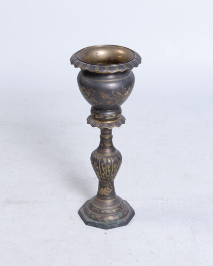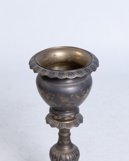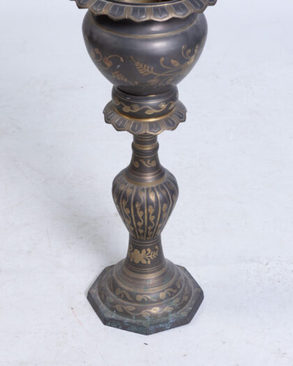 Ornate, pedestal black and gold metal planter. Ideal for displaying plants and flowers in any room in the house.