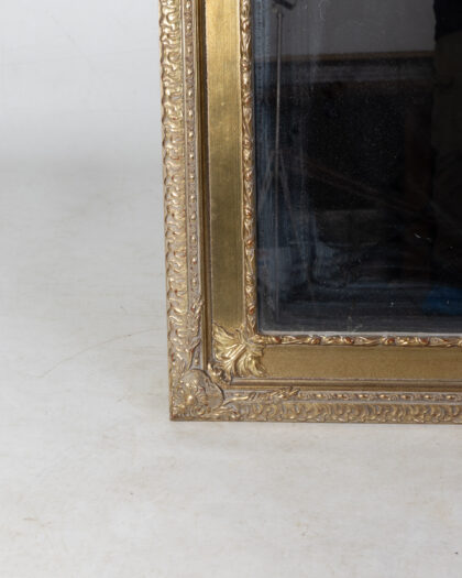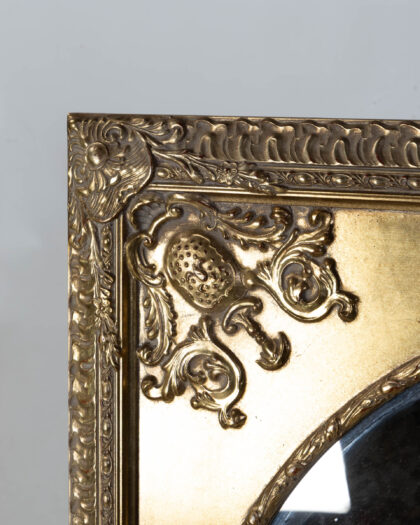 Ornate gold mirror with decorative frame. Ideal for adding elegance to any room. Wood backing. Would look lovely in any setting.