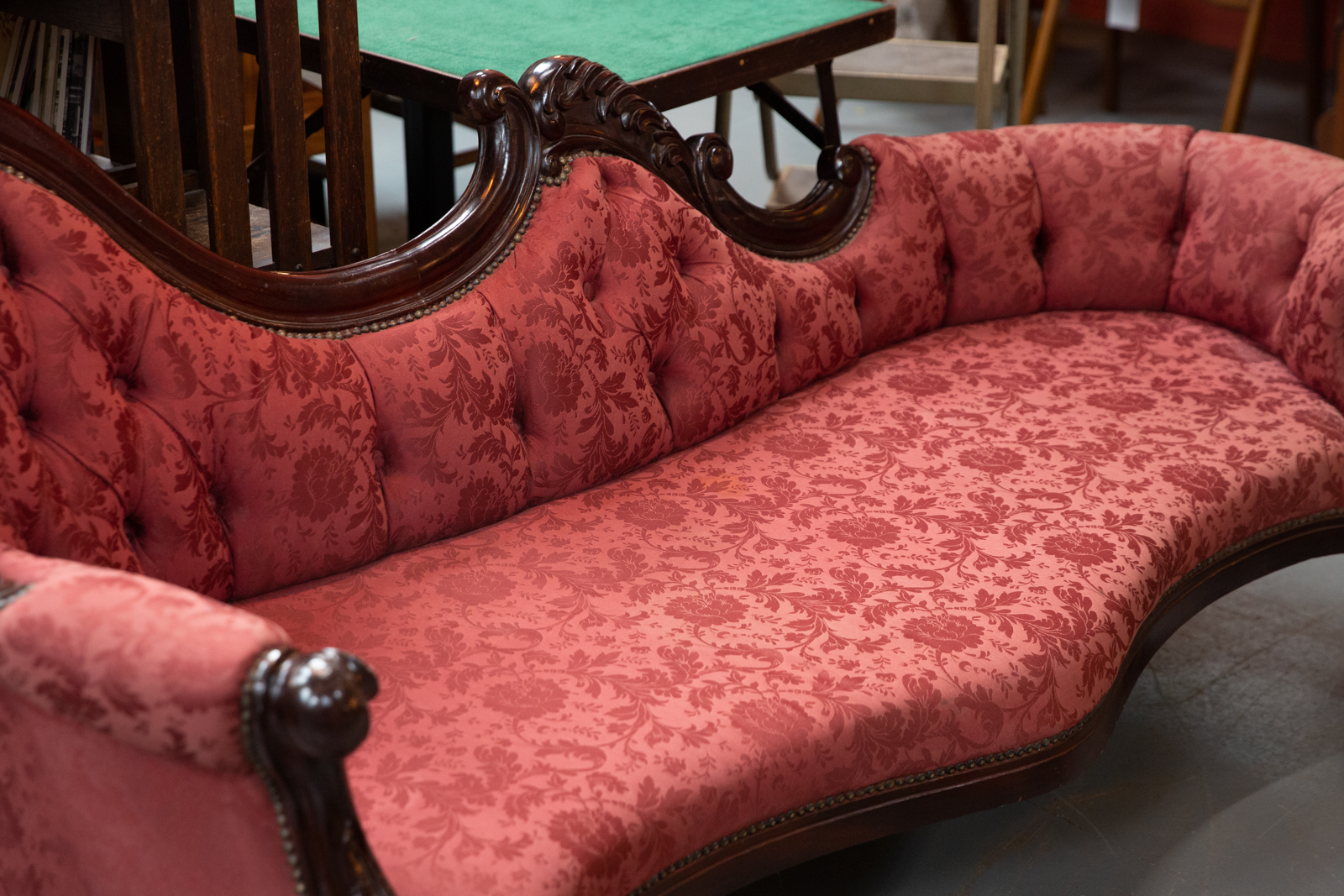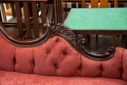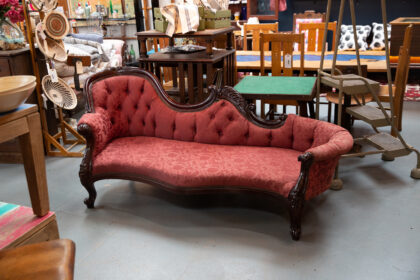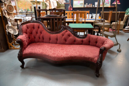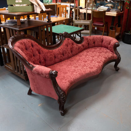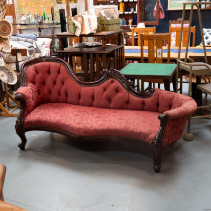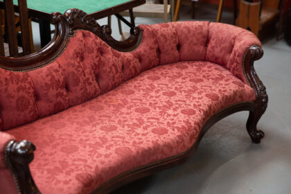 We sourced this striking chaise/couch from County Leitrim; it has been upholstered in recent decades, and shows some signs of use on the fabric.