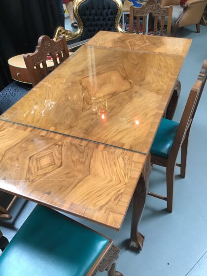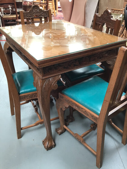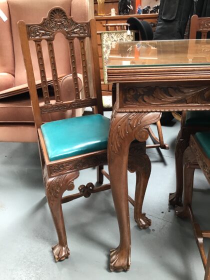 Deeply carved ornate set of four chairs and matching extending table.