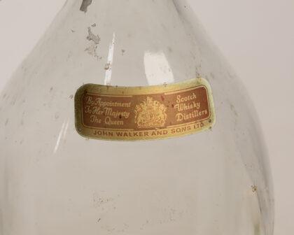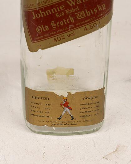 Empty, oversized vintage Johnnie Walker Red Label Old Scotch Whisky bottle. Features original labels including the John Walker & Sons Ltd Kilmarnock label. Shows 'By Appointment To Her Majesty The Queen, Scotch Whisky Distillers'. The bottom label lists awards from 1880-1897. The bottle is in fair condition, with signs of age and use. A collectible item for Breweriana enthusiasts.