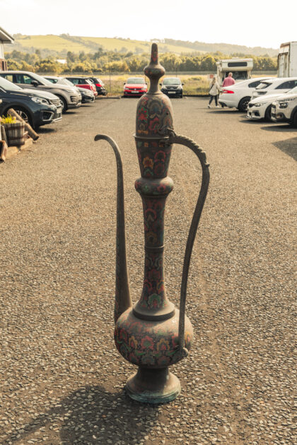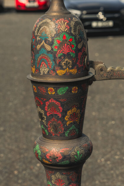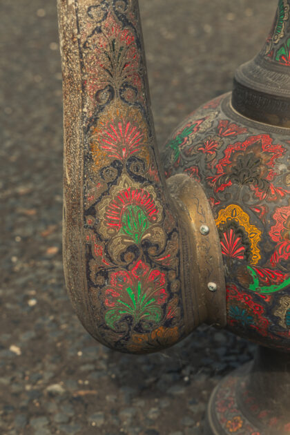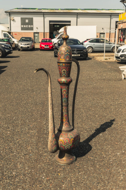 A large Middle Eastern brass teapot with coloured enamel inlays.