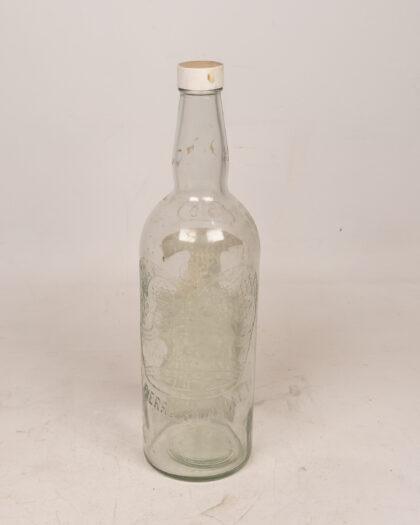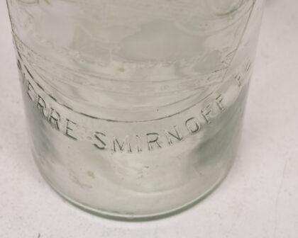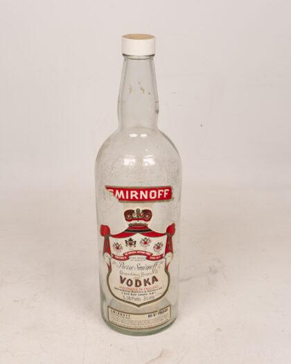 Vintage Smirnoff Vodka bottle, 3 litres. Clear glass with original label and embossed details. Collectible breweriana item in fair condition.