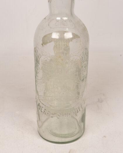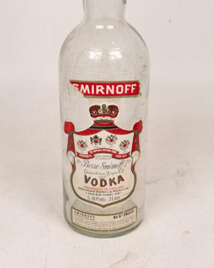 Vintage Smirnoff Vodka bottle, a collectible piece for breweriana enthusiasts. This clear glass bottle originally contained 3 litres of Smirnoff Vodka, produced in England. The bottle features the iconic Smirnoff label with the Imperial Russian Court crest. The bottle has the words 'Pierre Smirnoff Fils' embossed around the bottom. A great piece for display or collection. The bottle is in fair condition, showing some signs of age.